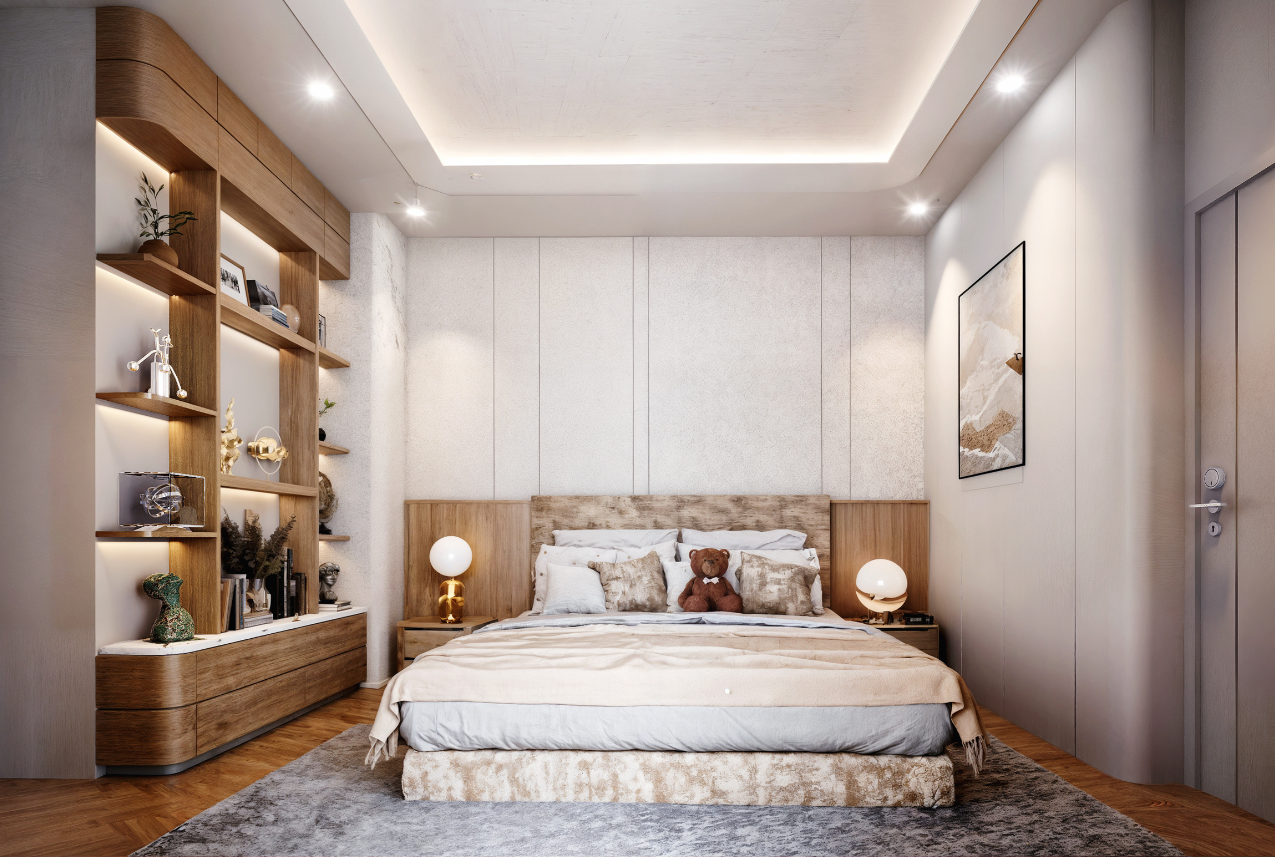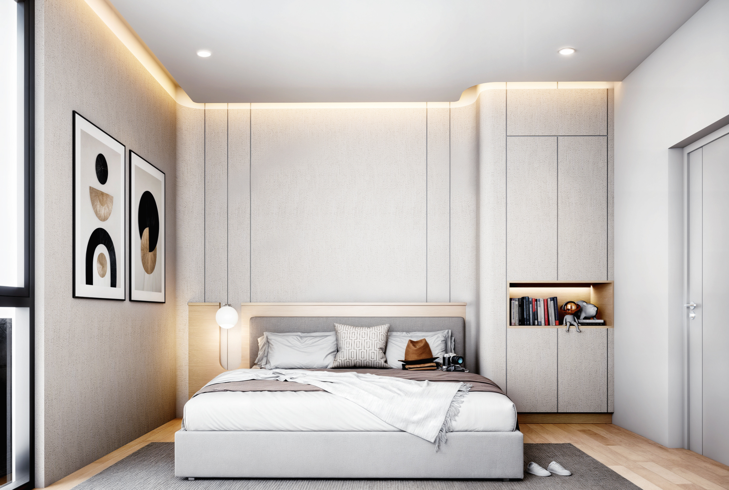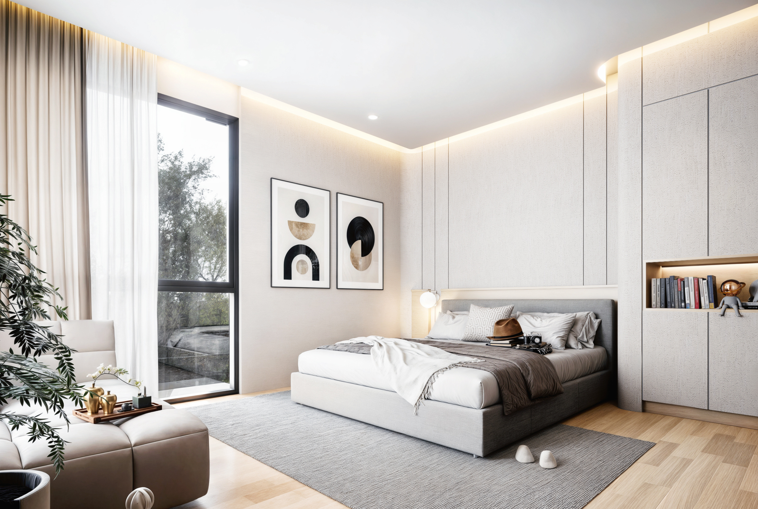 A cozy and contemporary bedroom designed with comfort in mind, offering a peaceful escape from the busy world.