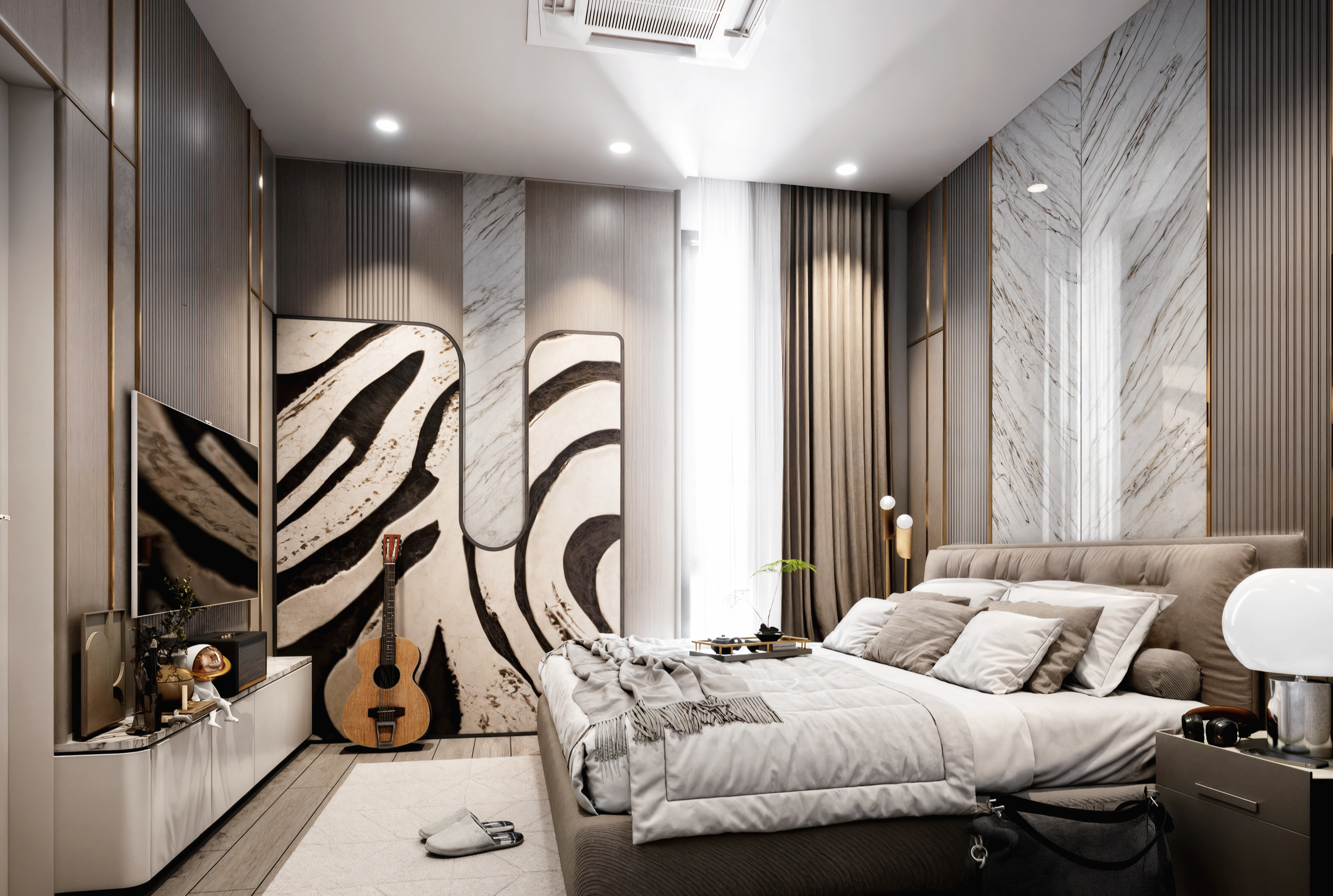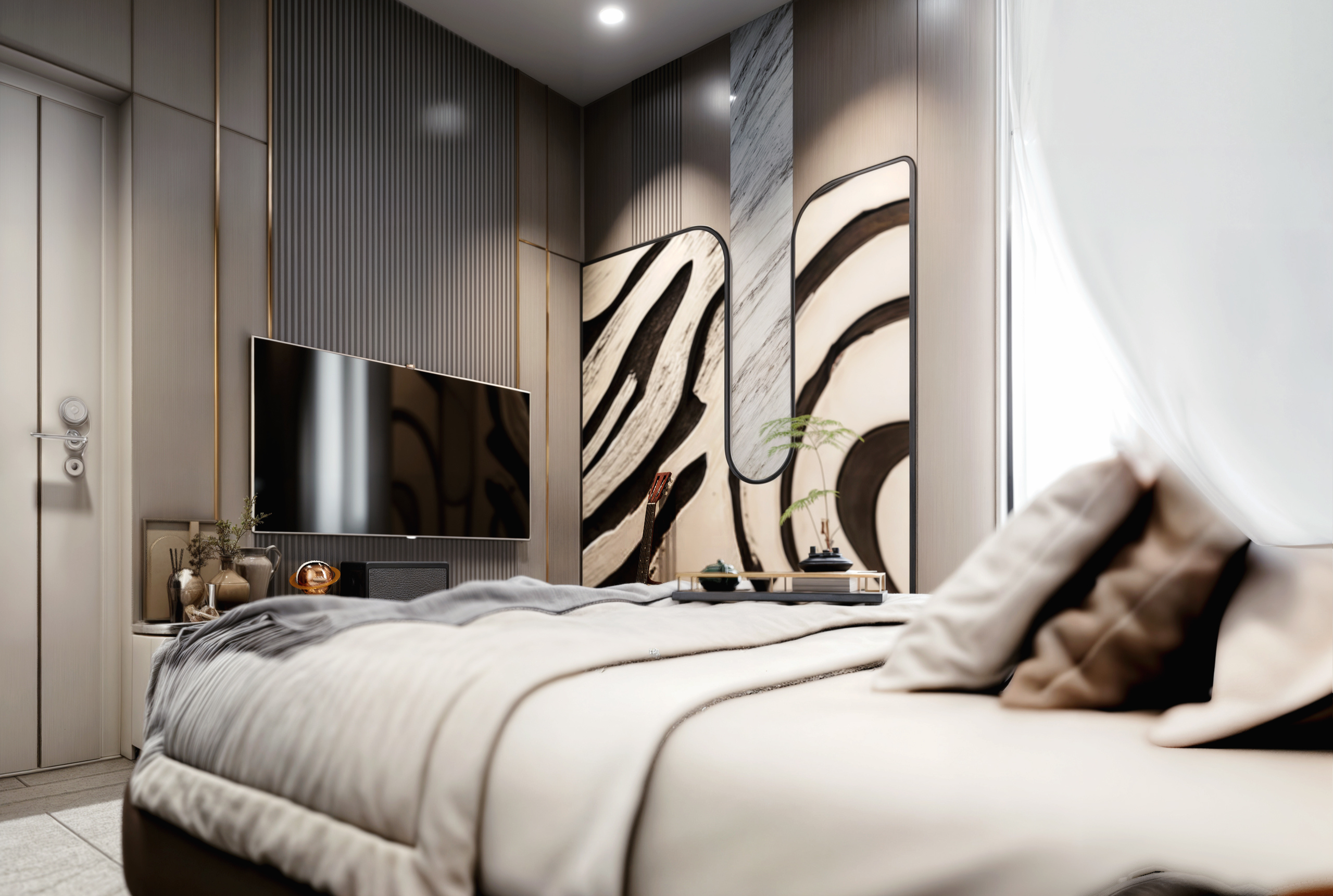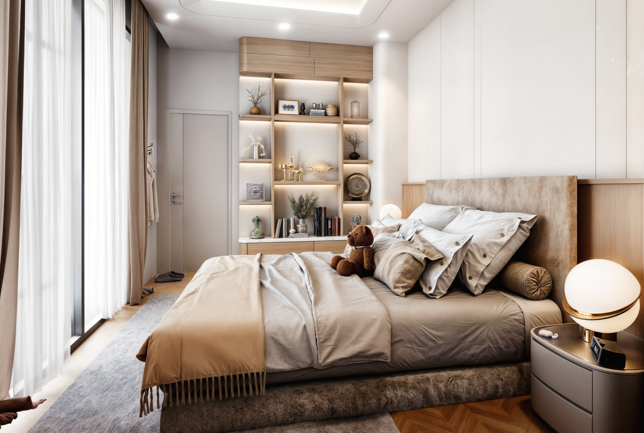 A cozy and contemporary bedroom designed with comfort in mind, offering a peaceful escape from the busy world.